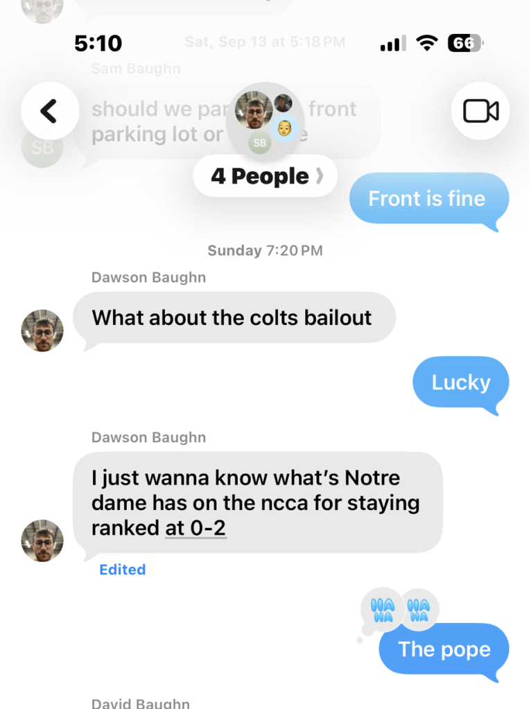 Why is the “pitchfork” in the title of the blog? Well, the Notre Dame game happened to overlap with the Indiana University vs University of Oregon game and we had two IU fans with us. My son was checking updates on his phone regularly, as was the lady sitting in front of me. They bonded over the Hoosiers ups and downs in between Notre Dame running away with the 2nd half. Indiana University has newfound life in its’ football program, they went from the bottom of the BIG10 in 2023-24 at 1 win, 8 losses to #2 in 2024-25 season (8-1) and are currently ranked #3 in the nation. My son begrudgingly wore a Notre Dame shirt, but insisted he had to wear his IU sweatpants to the game. Did I forget to mention that IUs one loss last year was to Notre Dame? 😁 It makes for a fun family rivalry. And IU’s symbol is a trident – not a pitchfork, however my father in law, a lifelong Purdue fan, referred to the IU symbol as the devil’s pitchfork. When the Irish had a rough start to this season I got this text: