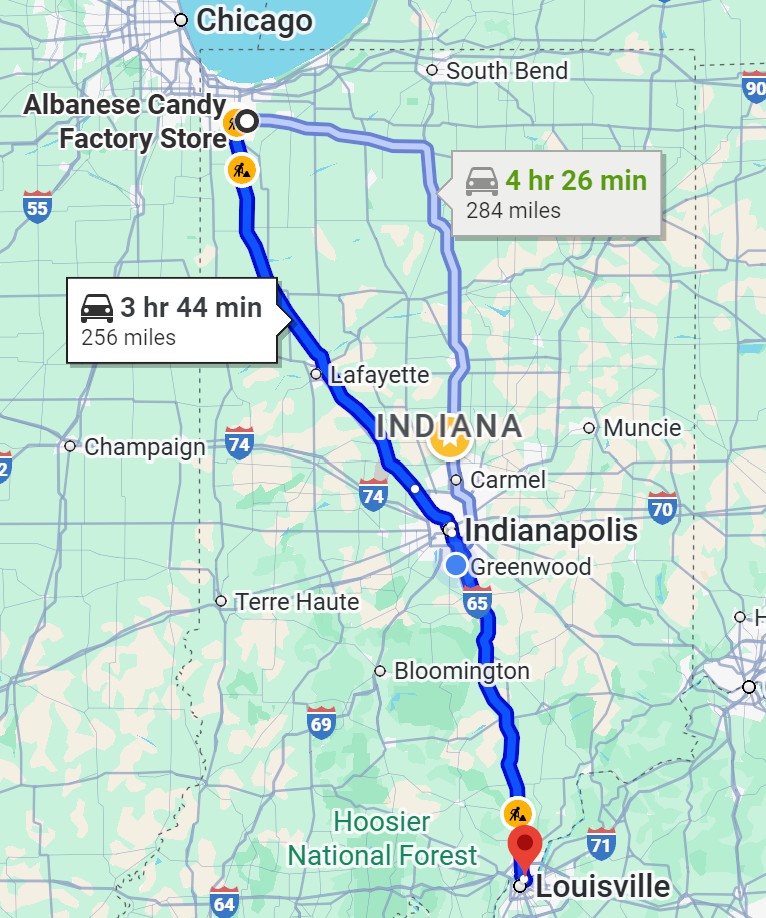 It’s 3 hours and 44 minutes from Albanese to Schimpff’s on I-65. I mean that seems like a reasonable set of stops for yummy goodness. 😁
