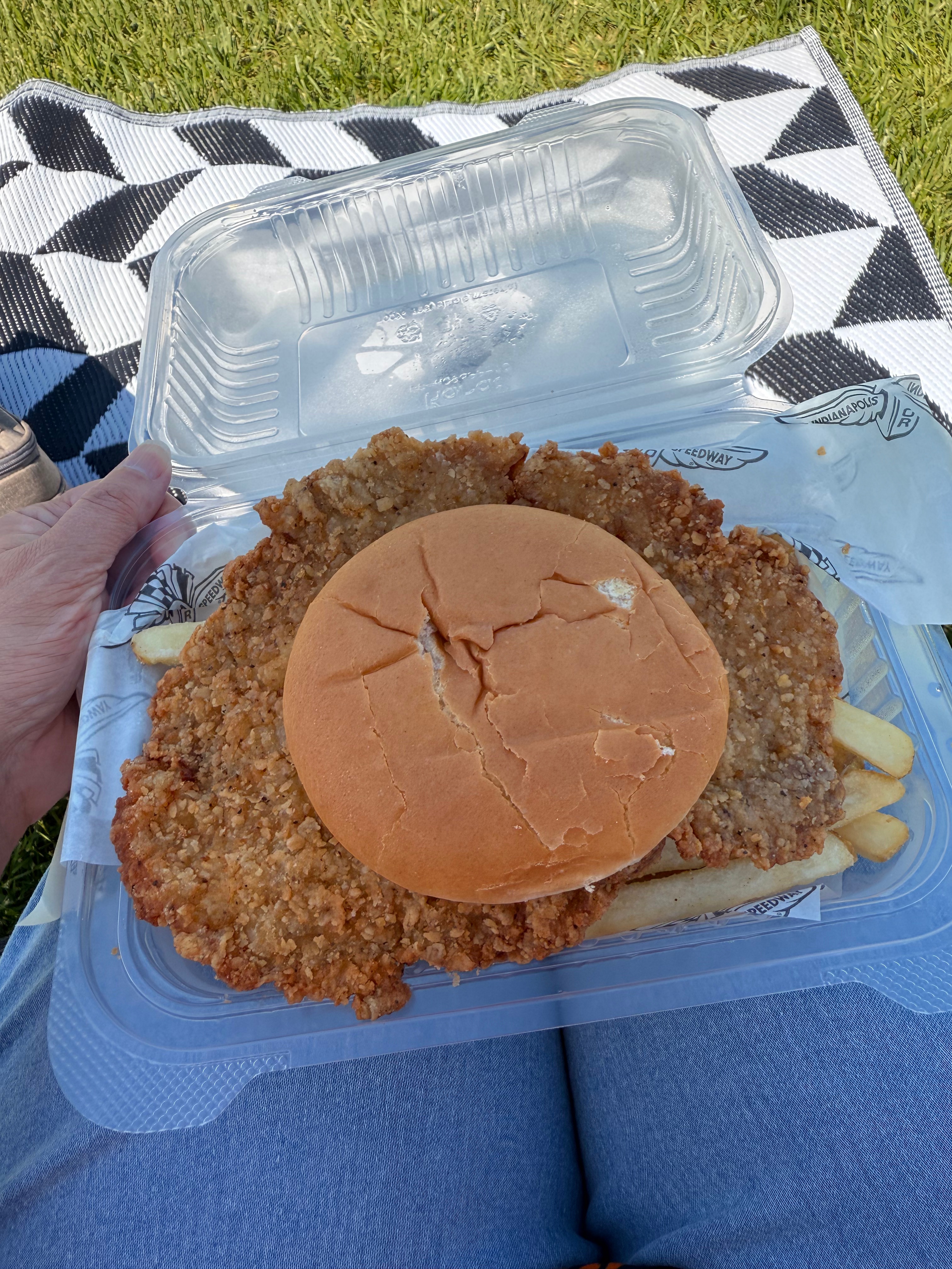There are multiple options for food and drinks all around the track, and yes you can get a tenderloin sandwich. Again, you’re not in Indiana if a tenderloin sandwich isn’t on the menu. You can bring in your own food and drinks if your cooler is no larger than 18”x15”x15” – we use backpack coolers for drinks and purchase food, but you do you. Yes, drinks include alcoholic if you choose. No judgement here. Since this is Barns, Brews and Backroads, you can get domestic beer (Coors/Miller Lite) for $8.99 (ish). There’s also multiple stands with mixed drinks and craft beer. Pictured below is the tenderloin and the world famous Track Dog. When I was growing up, the Track Dog’s were famous for being “green/gray” in color – they have improved. Not the best tenderloin you’ll get in Indiana, but not bad.