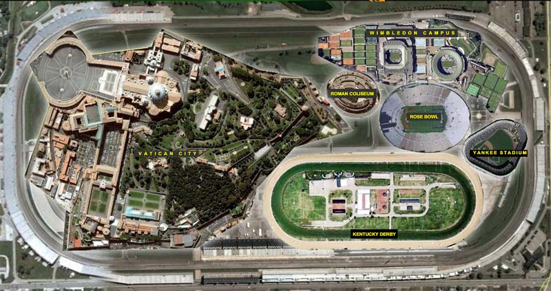 I walked nearly 12,000 steps and would have walked almost 3,000 more but a really nice guy gave us a ride on a golfcart. For reference, you can fit all of Vatican City plus Churchill Downs, Yankee Stadium, the Rose Bowl, the Roman Coliseum and Wimbledon all inside the oval track.